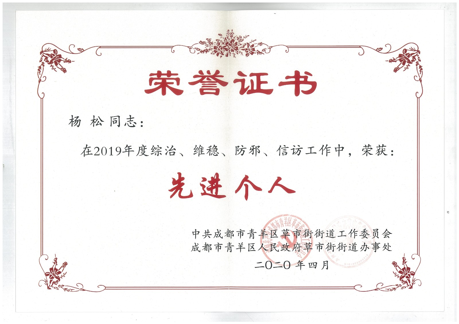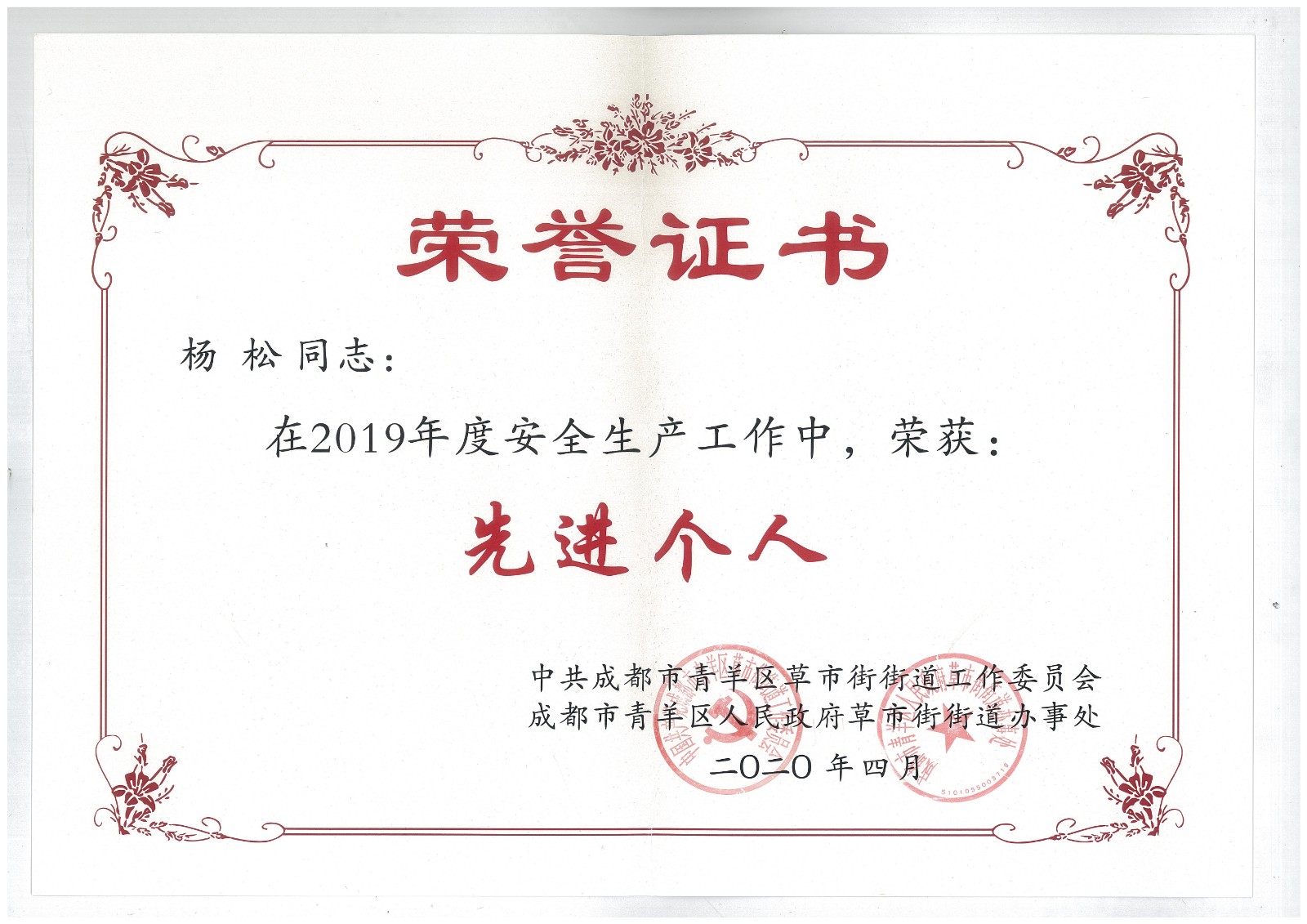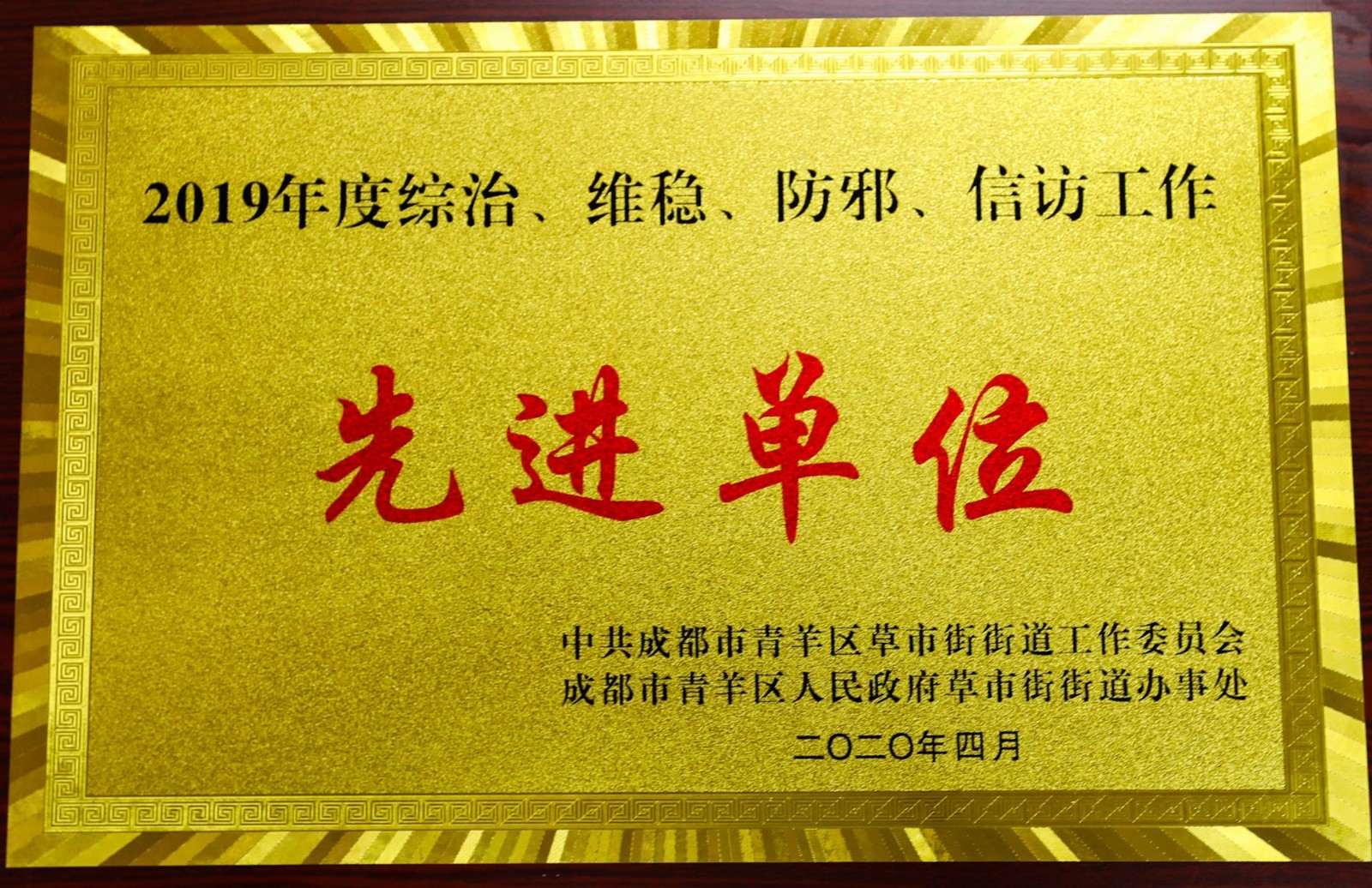 5月13日,公司屬地管理單位成都市青羊區(qū)草市街街道黨工委、街道辦事處聯(lián)合召開(kāi)會(huì)議,對(duì)2019年度安全生產(chǎn)工作及綜治、維穩(wěn)、防邪、信訪(fǎng)工作的先進(jìn)單位和個(gè)人進(jìn)行現(xiàn)場(chǎng)頒獎(jiǎng)并發(fā)文通報(bào)表彰。公司被表彰為2019年度草市街安全生產(chǎn)工作先進(jìn)單位;后勤服務(wù)部楊松同志分別被表彰為2019年度安全生產(chǎn)先進(jìn)個(gè)人和2019年度綜治、維穩(wěn)、防邪、信訪(fǎng)工作先進(jìn)個(gè)人。(后勤服務(wù)部)