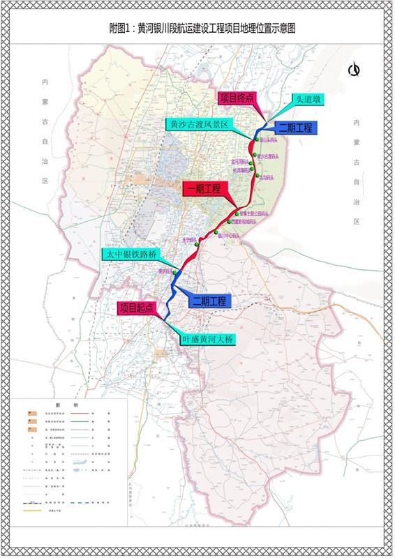 黃河銀川段航運(yùn)建設(shè)工程,上起葉盛黃河公路大橋,下至賀蘭溜山頭渡口,全長約85千米。按照內(nèi)河Ⅴ-(3)級標(biāo)準(zhǔn)進(jìn)行整治,建設(shè)內(nèi)容包括整治工程、疏浚工程、護(hù)岸(護(hù)洲)工程,同時按內(nèi)河三類標(biāo)準(zhǔn)建設(shè)航標(biāo)工程、新建碼頭10處及配套設(shè)施的建設(shè)。