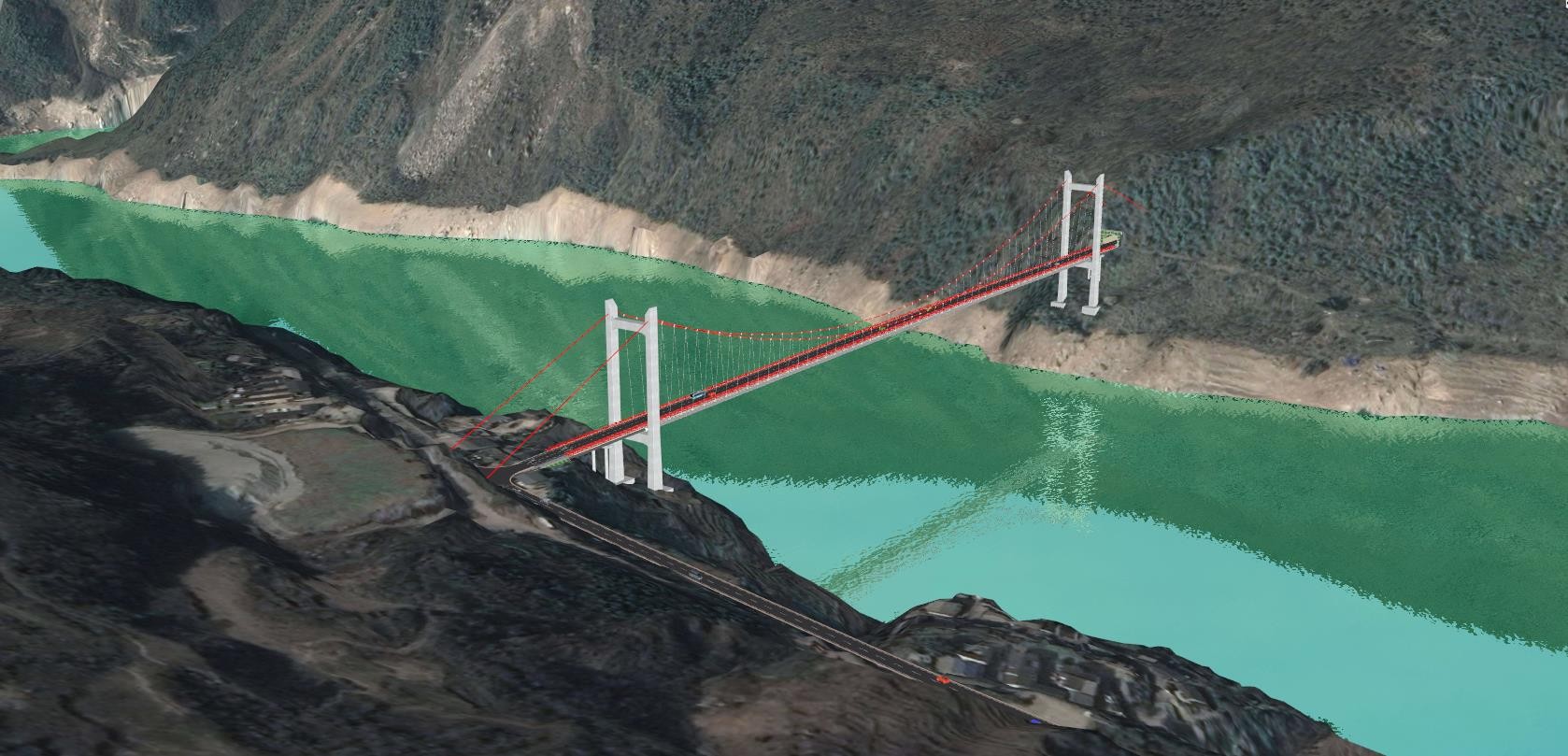 紫坪鋪水庫特大橋是G317線友誼隧道至映秀改建工程在映秀鎮(zhèn)群益村跨越紫坪鋪水庫的控制性工程。主橋?yàn)?85m的雙塔單跨簡支鋼板組合梁外張空間纜懸索橋,兩岸邊纜跨度125m。該橋共設(shè)2根外張空間主纜,主纜采用1770MPa高強(qiáng)鍍鋅鋼絲預(yù)制平行索股結(jié)構(gòu);全橋共布置53對(duì)吊索,吊索采用1770MPa高強(qiáng)鍍鋅鋼絲預(yù)制平行索股,吊索與索夾、加勁梁采用銷接方式連接。主索鞍采用全鑄式結(jié)構(gòu),鞍底設(shè)置座板作為滑動(dòng)副;散索鞍采用擺軸式,鞍體采用鑄焊結(jié)合的結(jié)構(gòu)形式。主纜采用高強(qiáng)鋼拉桿錨固系統(tǒng),兩岸均采用隧道錨結(jié)構(gòu)。加勁梁采用鋼板組合梁,由鋼格子梁通過剪力釘與預(yù)制混凝土橋面板結(jié)合而成。橋塔采用鋼筋混凝土門形框架結(jié)構(gòu),兩塔柱豎直布置,都江堰岸塔高90.55m,映秀岸塔高94.05m,基礎(chǔ)為分離式承臺(tái)+群樁基礎(chǔ)。