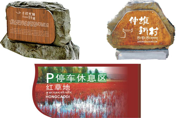 在交通標(biāo)識(shí)基本風(fēng)格上,采用標(biāo)題文字(中、藏、英)和香格里拉具有代表性的圖片相結(jié)合,以達(dá)到醒目識(shí)別和廣告宣傳的目的。