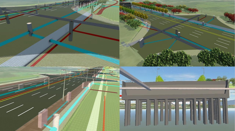 園區(qū)BIM模型的建立時(shí)間在設(shè)計(jì)評(píng)審?fù)瓿珊?、施工單位進(jìn)場(chǎng)前,通過(guò)設(shè)計(jì)、業(yè)主、施工、監(jiān)理四方最終確定三維園區(qū)模型。道路模型的建立,能夠準(zhǔn)確無(wú)誤地將路基、橋涵、通訊、電力、排水等專(zhuān)業(yè)設(shè)計(jì)信息直觀反映,基于精準(zhǔn)模型的錯(cuò)漏碰缺檢查,為業(yè)主在項(xiàng)目施工之前發(fā)現(xiàn)問(wèn)題提供了充分的依據(jù)和協(xié)助。